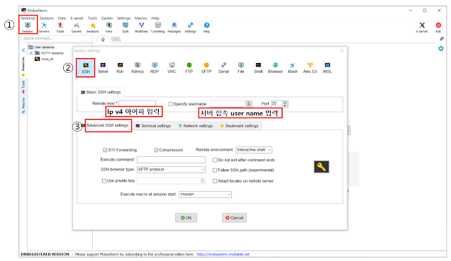 세션클릭 -> SSH -> Advanced SSH Setting 클릭하여 설정