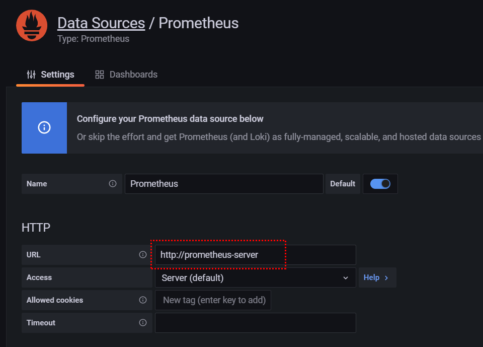 HTTP 서버에 대한 URL 정보에 도메인 정보를 입력하자. 프로메테우스의 도메인 이름은 서비스를 확인하면 된다.