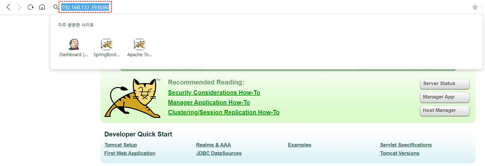 톰캣 서버는 기본적으로 8080 포트로 설정돼있기 때문에 웹브라우저에서 해당 우분투 서버의 8080 포트로 접속해 톰켓 서버가 정상 실행중인지 확인합니다.
