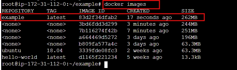 - docker build -t example . 를 입력하여 도커를 새로 빌드하자