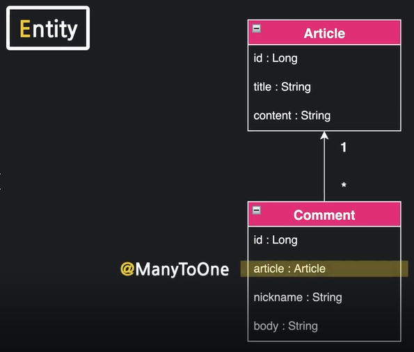 거꾸로 댓글의 입장에서는 Many-to-One 다대일 관계라고 볼 수 있다.