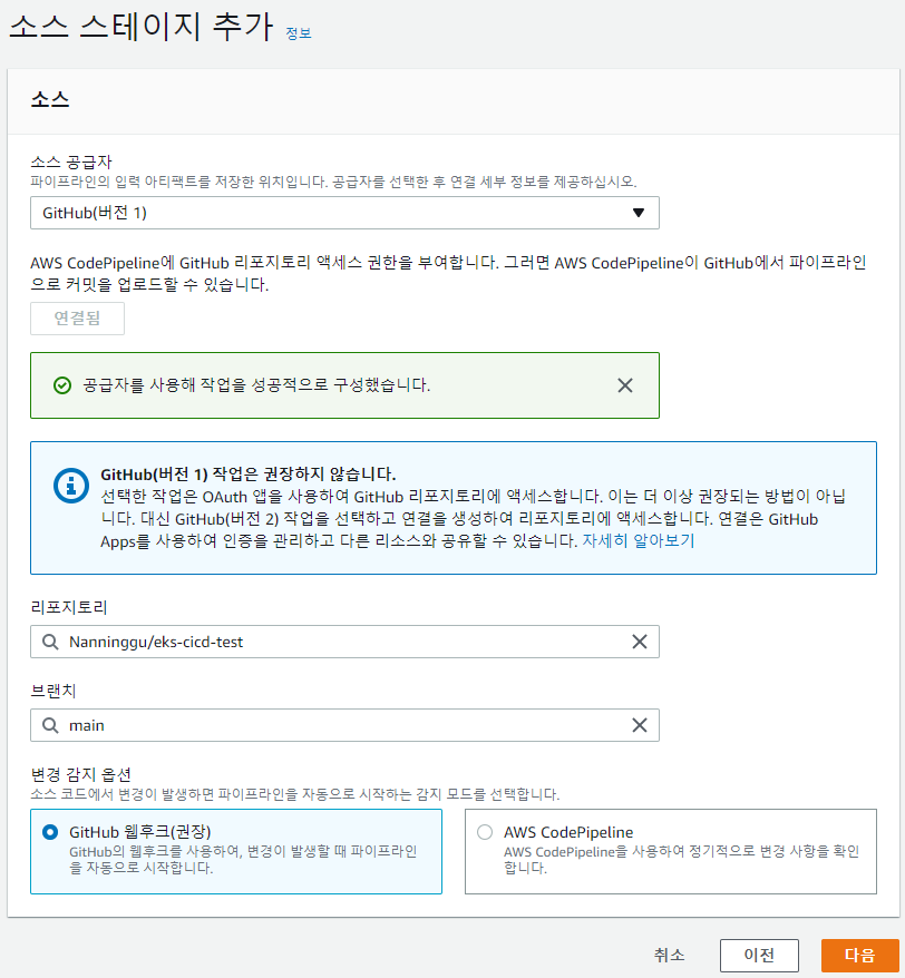 2. 소스 공급자에서 GitHub(버전1)으로 지정하고 연결을 선택, 사용할 레파지토리를 연결한다.
