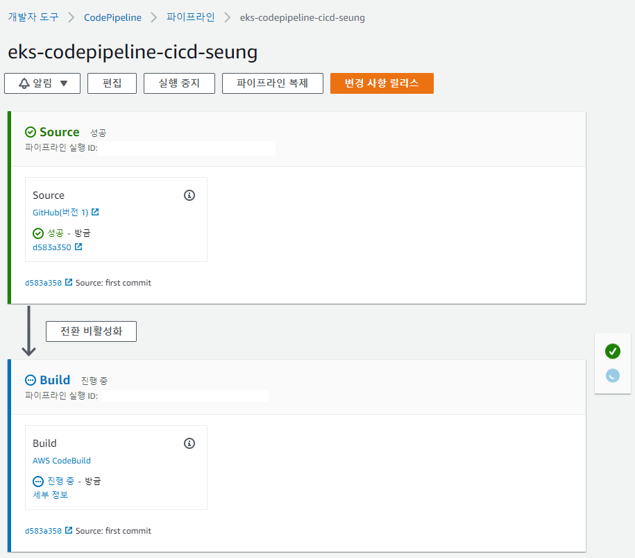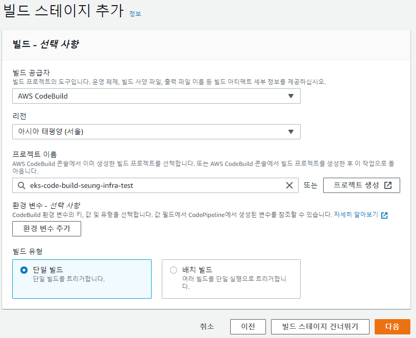 3. 빌드 공급자는 아래와 같이 이전에 생성한 AWS CodeBuild를 선택 후 파이프 라인을 생성 한다.