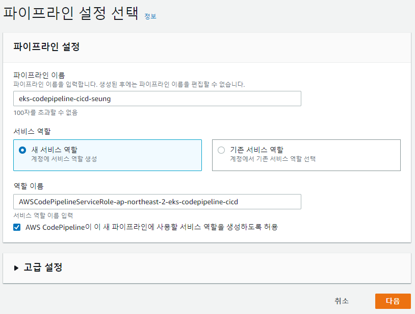 아래의 화면에서 파이프라인의 이름과 새 역할을 선택 후 다음으로 넘어 간다.