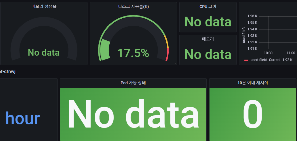 프로메테우스 및 그라파나를 제대로 공부하려면 책 몇권이 필요하지만, 그정도의 열정은 없으므로, 쿼리를 수정하는 방법을 찾기위해 구글 검색은 필수 이다... 일부 정보가 No data를 화면에 뿌려주는 문제가 있으므로, 해당 문제를 해결하기 위해서는 그라파나 & 프로메테우스의 모니터링 값을 가져오는 쿼리정보를 수정해 줘야 한다.