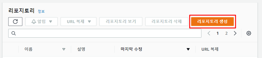 아래와 같이 리포지토리 생성을 클릭하여 새로운 리포지토리를 생성한다.