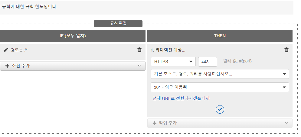 2. 리스너 규칙에서 아래와 같이 수정을 해줍니다. HTTP로 받은 데이터를 HTTPS로 리다이렉트를 수행 합니다.