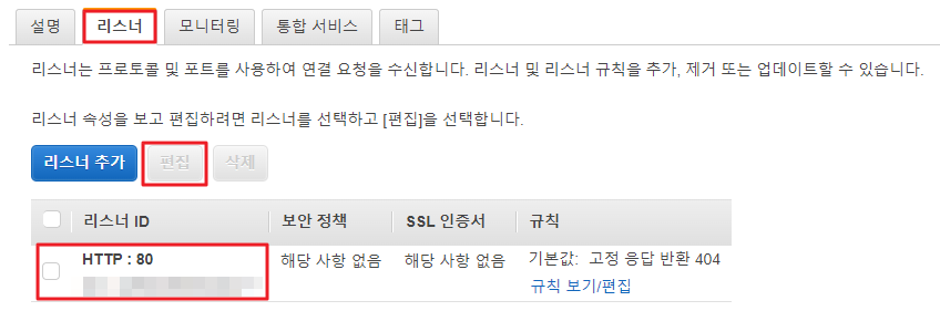 1. AWS 로드밸런서 탭에서 리스너를 선택 후 아래와 같은 화면으로 이동 합니다.