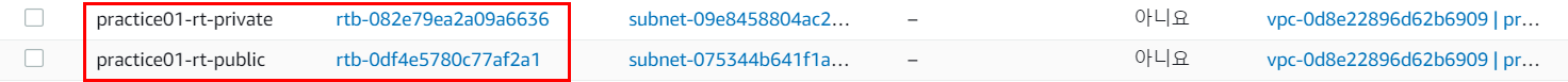 하지만 지금은 NAT 게이트웨이를 구성하면 EIP도 생성해야 하고, 여러가지 비용이 발생하므로, 실습 및 연습용 이므로 퍼블릭과 프라이빗 모두 언터넷 게이트웨이에 연결하도록 하겠다.